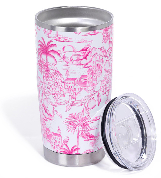 Meteor drinkware and accessories are durable and reliable with a splash of artwork that makes them stylish as well. This travel tumbler keeps drinks hot or cold longer, reduces condensation, and features a vintage tropical city design. Spill-proof lid included. Holds 20 oz.