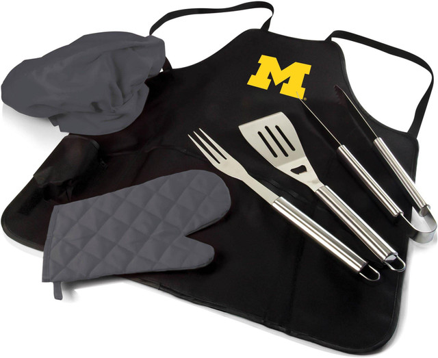 The BBQ Apron Tote Pro features a tote that converts to a full-sized apron with adjustable straps and deluxe barbecue tool set. Set includes a large spatula with bottle opener, a large fork, and tongs. Measures 19'' x 18'' x 2'' and weighs 5 lbs.