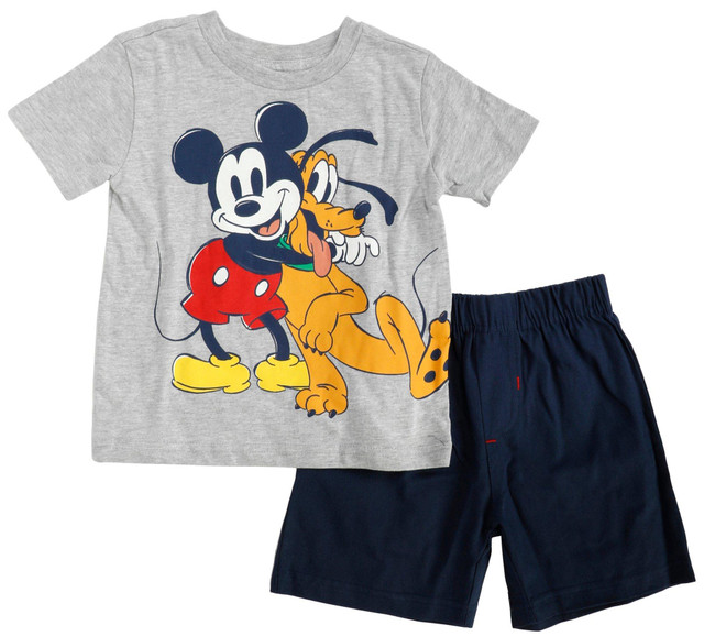 This baby boys two piece shorts set includes a graphic t shirt featuring a playful Mickey and Pluto design and solid pull on shorts. Soft and cheerful it is perfect for everyday adventures and easy all day comfort.