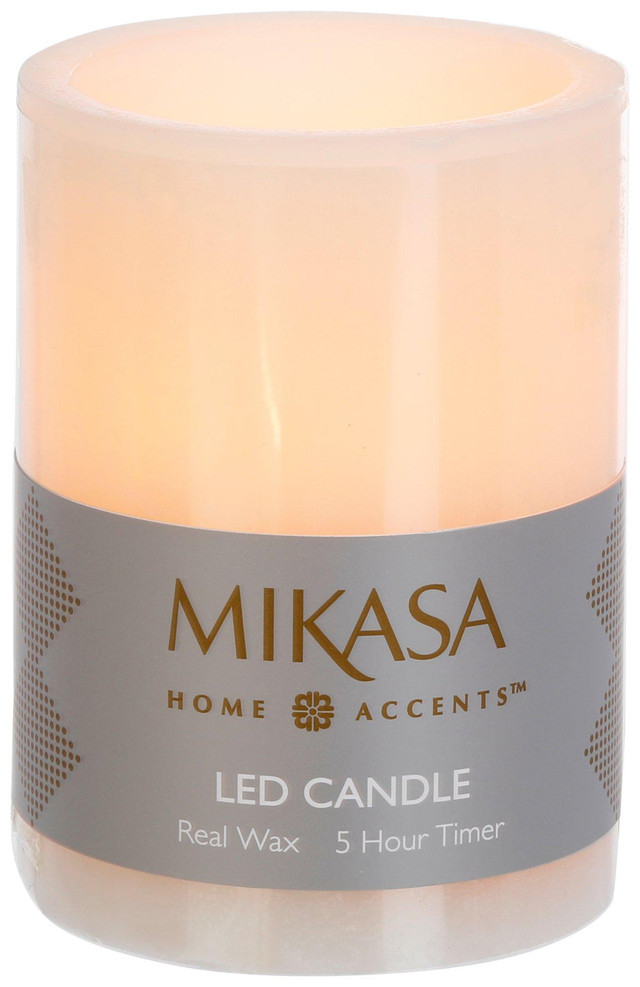 Create ambient lighting with this 4 in LED Wax Pillar Candle, crafted from real wax for an authentic look and feel. Features a built-in LED light and a convenient daily timer that turns off after 5 hours and back on 19 hours later. Operates with 2 AA batteries, not included. Ideal for safe, flameless illumination in any setting. Measures approximately 4 in x 3 in round.