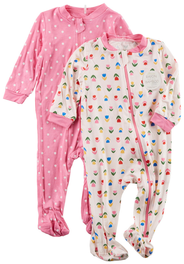 Wrap your little one in cozy comfort with this Baby Sleeper 2 Pack! Made from soft and breathable bamboo fabric, these sleepers are cool to the touch and perfect for restful nights. One features a classic polka dot design, while the other showcases a playful floral print. Designed with footed bottoms and a full length zipper from neck to ankle, they allow for easy changes. The crew neck and snug fit ensure warmth and flexibility, making this set a must have for bedtime or lounging.