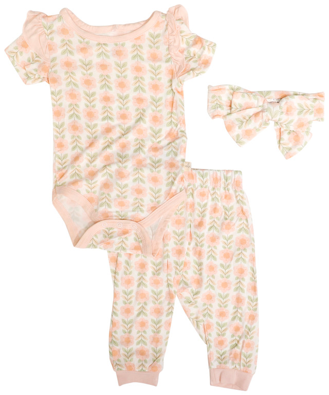 Sweet and stylish for your little one! This baby girls' 3-piece floral creeper set includes a short sleeve creeper, soft knit joggers, and a matching headband. Made from gentle fabric, it is perfect for warm days and picture perfect moments. Fabrication 95% rayon made from bamboo, 5% spandex
