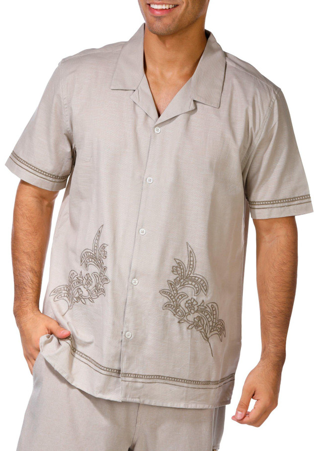 Step up your style with this Mens Embroidered Button Down Shirt. Featuring short sleeves, a collared neckline, and detailed embroidered design, it is finished with a button front closure. Fabrication 100% cotton