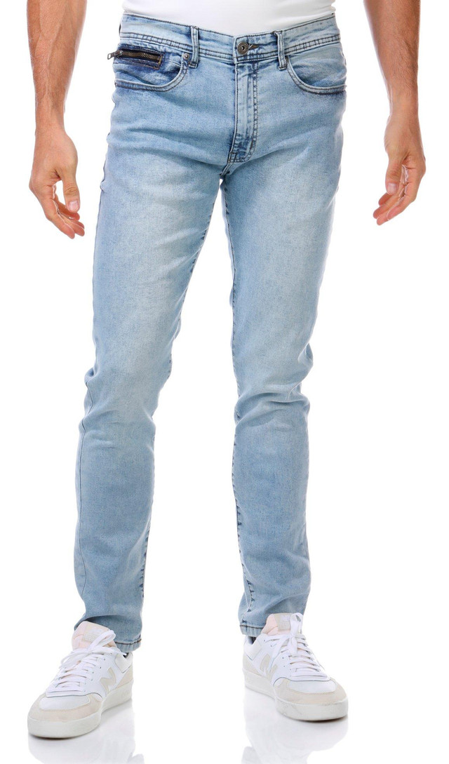 Crafted for a sleek silhouette and everyday comfort, these jeans feature a unique front zipper pocket for added edge and function. The light wash finish delivers a clean modern vibe that pairs easily with tees or jackets. Inseam measures approximately 31 in. Fabrication is 86% cotton, 10% polyester, 2% elastane, 2% viscose.
