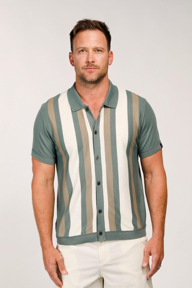 This Men's Stripe Sweater Button-Down Shirt offers a stylish blend of comfort and sophistication. Made from 100% polyester, it features a soft sweater-like texture with a classic button-down design and modern stripe pattern. Perfect for layering or wearing on its own, its a versatile addition to any wardrobe.