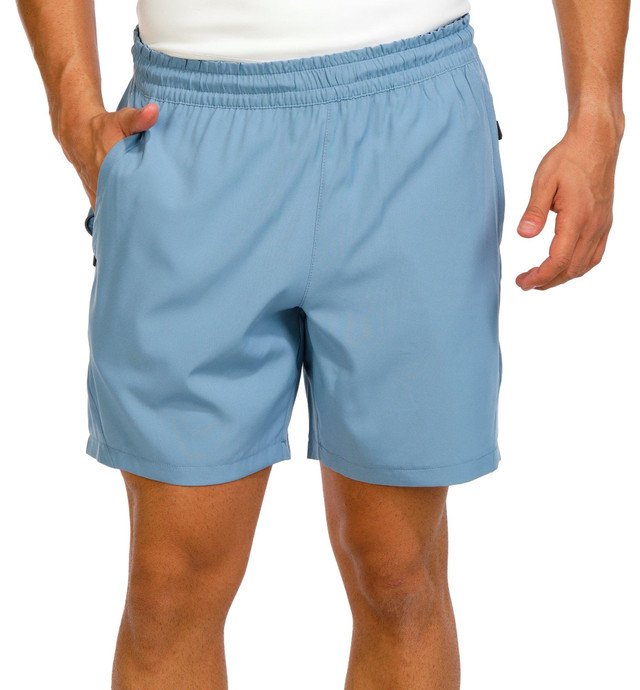 The Men's Active 7 in Tempo Shorts feature a solid color and elastic waistband for a secure fit. Side zip pockets offer convenient storage, while the 7 inch inseam provides a balanced length for movement and comfort during workouts or casual wear. Fabrication 95% polyester, 5% spandex.