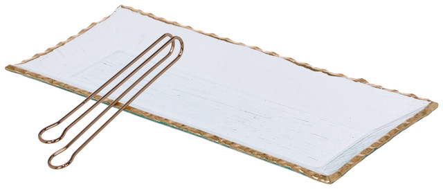 Elevate entertaining with the 2 Pc Glass Serving Platter and Tongs Set. Featuring a textured glass platter with elegant gold edging and matching gold tongs, it adds refined style to gatherings or special occasions. Hand wash recommended for lasting beauty..