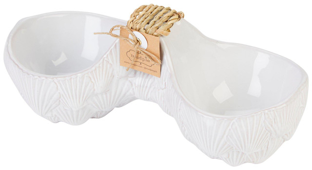 This double bowl serving dish features seashell designs on glazed terracotta with a rattan-wrapped center handle, combining coastal charm with functional elegance for serving snacks or dips. Measures approximately 10 in x 4.5 in x 4 in.