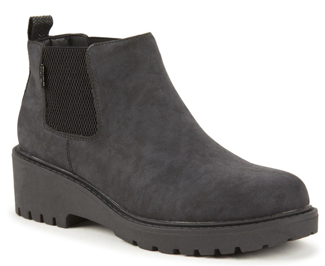 The wedge heel and lug sole of the Chelsea-inspired MUK LUKS Women's Francis Boot are just the beginning. Slide these on with the textured, patterned back tab and side insets to discover the signature Muk Luxe lining in a boot you'll never want to take off. Features memory foam insole, faux leather, polyester upper and pull-on style. Ankle height works with any style of pants. Heel height: 2.32 in. Platform height: .79 in. Boot shaft height: 3.5 in. Boot shaft circumference: 10.55 in.
