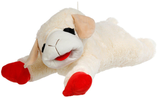 Soft, snuggly, and full of charm, this Lamb Chop Dog Toy is perfect for pups who love a gentle companion with a playful twist. With built-in squeakers, in the feet and body, and plush texture, its great for cuddles, light chewing, and fetch. Fabrication is 100% Polyester. Measures approximately 24 in x 11 in x 9 in.