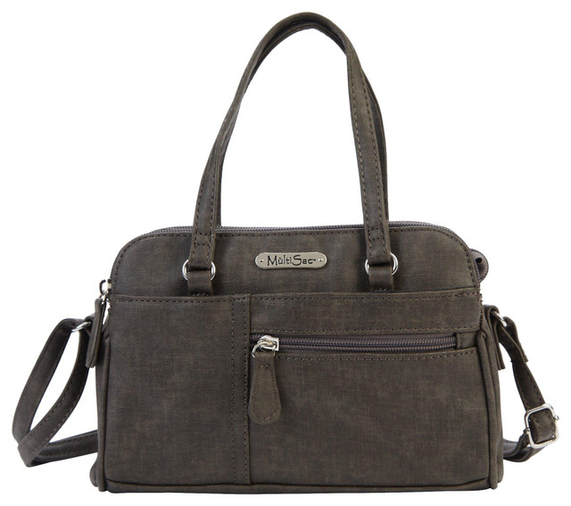 The Caldwell satchel bag features six spacious pockets for organized storage. Designed with double shoulder straps and a long adjustable strap, it offers flexible carrying options for everyday convenience. It includes three satchel-style compartments with an inner zipper, an outer zipper, and an exterior zipper pocket for added accessibility. Measures approximately 10 in x 4 in x 7 in.