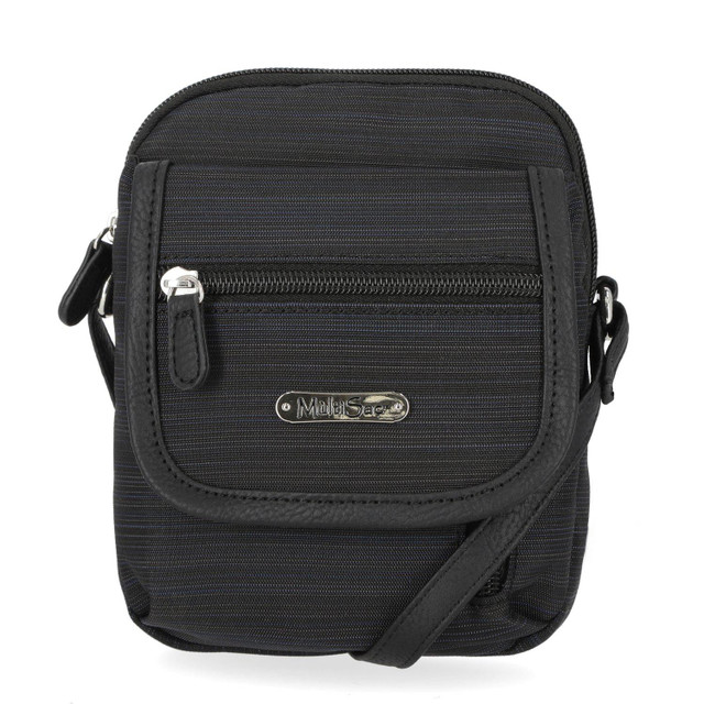 This Everest mini crossbody handbag from MultiSac features a solid embossed, denim design, an adjustable strap, two exterior front zip pockets, one exterior front snap pocket, and top zip closure. The lined interior includes one slip pocket. Measures approximately 6 in. L x 1 in. D x 7 in. H. Strap drop approximately 27 in.