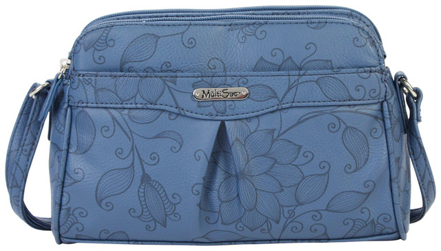 The MultiSac Crossbody with floral print in blue offers both charm and versatility. Designed to be worn as a crossbody or short shoulder bag, it features an adjustable strap for a custom fit. With multiple exterior pockets including zippered, slip, and Velcro styles, plus a built-in key ring, it keeps your essentials organized and easily accessible. Perfect for adding a touch of floral flair to your everyday look.