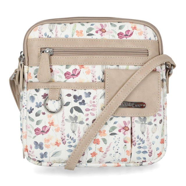 Introducing the Floral N/S Zip Around Crossbody Bag - perfect for everyday activities! This bag features a stylish and durable faux leather exterior with sleek silver-tone hardware and a floral design. The adjustable crossbody strap ensures a comfortable fit, while the two top zip compartments, front and back zip pockets, and front slip pockets provide ample storage for your essentials. Measures 8 in. x 2 in. x 8 in.