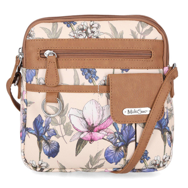 The North South Zip Around Crossbody by MultiSac features an adjustable strap, exterior pockets, interior pockets, cell phone pocket, and zipper closures. Includes a solid vegan leather fabrication. Handbag measures approximately 7.75'' L x 3.5'' W x 8'' H.