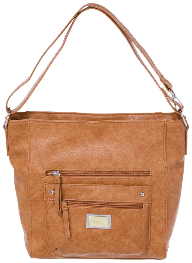 This womens handbag converts from crossbody to shoulder strap and features a zippered top with outside pockets. The solid color design offers versatile style and practical organization for everyday use. Measures approximately 12 in x 10 in x 5 in.
