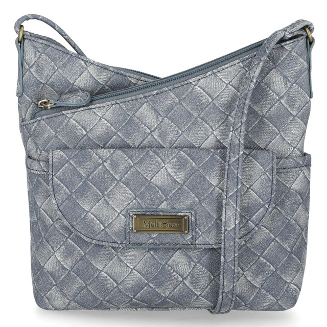 This Vista crossbody handbag features a solid heathered exterior on nylon fabrication, an adjustable crossbody strap, one front exterior flap snap pocket, and 2 asymmetrical zip pockets that snap together to form a third compartment. The lined interiors include one zip pocket and two slip pockets total. Measures approximately 8 in. L x 3 in. D x 8 in. H.