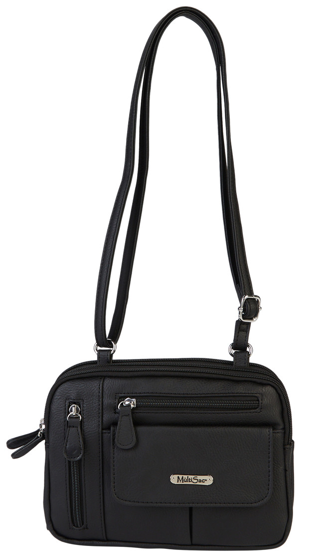 The Zippy Black Crossbody by MultiSac features a smooth, vegan leather design, an adjustable strap, front flap pocket, exterior zipper pockets, three zip compartments with credit card slots, interior zipper pocket & interior slip pockets. Crossbody handbag measures 9.5 in. x 3 in. x 7 in. with a 30 in. drop.