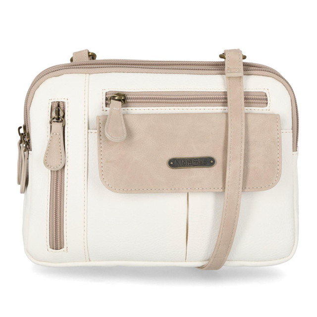 The Zippy Organizer Crossbody handbag from MultiSac features a smooth design, vegan leather with solid color details, an adjustable crossbody strap, 1 front flap pocket, 2 front zip pockets, 1 back slip pocket, and 3 top zip closures. The lined interior includes 2 open compartments, with the third rear compartment featuring a zip around opening containing 6 credit card slots and 1 divider zip pocket. Measures approximately 9 in. x 3 in. x 7 in. Strap drop approximately 26 in.
