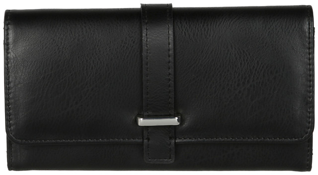 This black wallet features a foldover design with a secure snap closure and built in RFID protection. The interior includes labeled sections that function like a filing system, keeping cards and essentials neatly organized with plenty of space for easy access. Measures approximately 7.5 in x 0.75 in x 4 in.