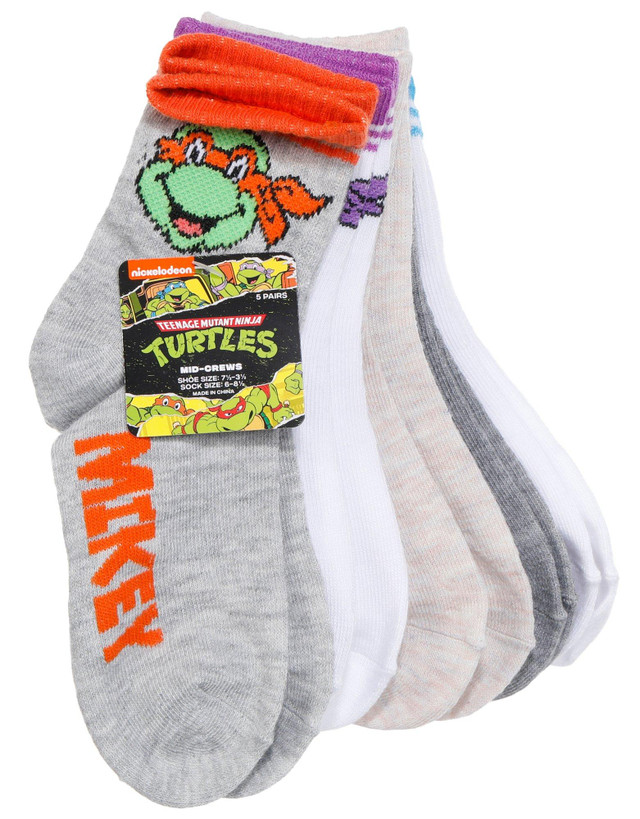 This 5-pack of boys' Teenage Mutant Ninja Turtles crew socks features bold character designs inspired by Leonardo, Donatello, Raphael, and Michelangelo. Sized to fit shoe sizes 7.53.5 and sock sizes 68.5, each pair is made from soft, stretchy fabric for all-day comfort. The crew length provides extra coverage and a secure fit, perfect for everyday adventures and turtle-powered fun.