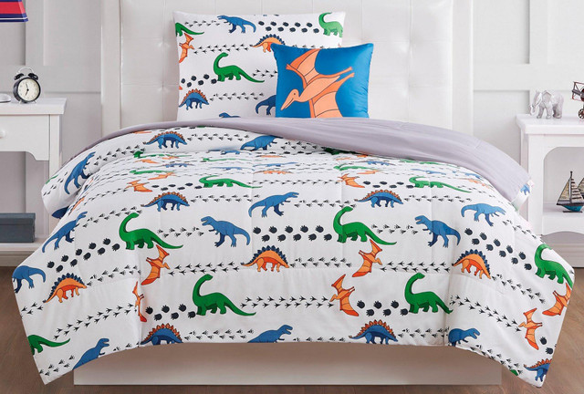 This dinosaur bedding pattern has all the giant lizards you can handle making tracks across your bed includes a decorative pillow and shams help you complete the top of the bed. Set includes one comforter, two pillow shams (1 twin), and one decorative pillow (16 x 16 inches).