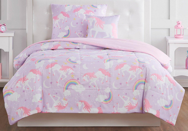This unicorn bedding pattern is printed on a soft woven microfiber face fabric. The print includes unicorns, rainbows and a twinkling night sky to wish you only sweet dreams. To finish the look, we included a decorative pillow with a large unicorn on it just for you. Set includes one comforter, two pillow shams (1 twin), and one decorative pillow (16 x 16 inches).