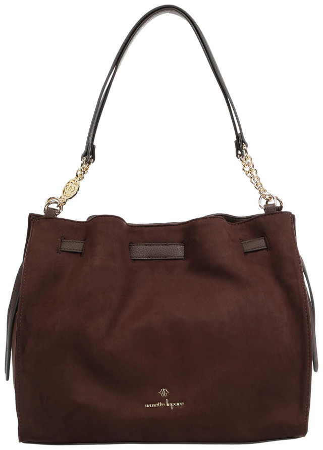 This shoulder bag blends stylish metal accents with functional design perfect for everyday use. The soft suede body and leather accents create eye catching texture, while gold chain straps adds style and elegance. Measures: 13.5 in. W x 11 in. H x 5 in D. Strap: 10 in. drop.
