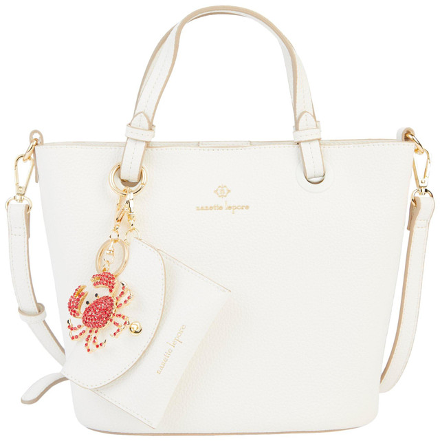 The Gianna Crossbody Bag features a luxe pebbled leather exterior with gold-tone hardware, a sparkling rhinestone crab charm, and a removable zip pouch for added versatility. Stylish and functional for day-to-night wear. Crossbody bag measures 11 in x 5 in x 9 in.