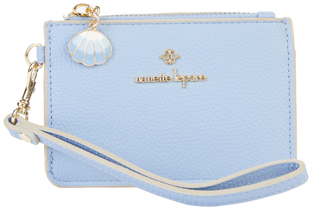 Elevate your essentials with this light blue wristlet featuring a sleek design and gold-tone hardware. Complete with a detachable strap and seashell charm, its perfect for carrying cards and cash in style.