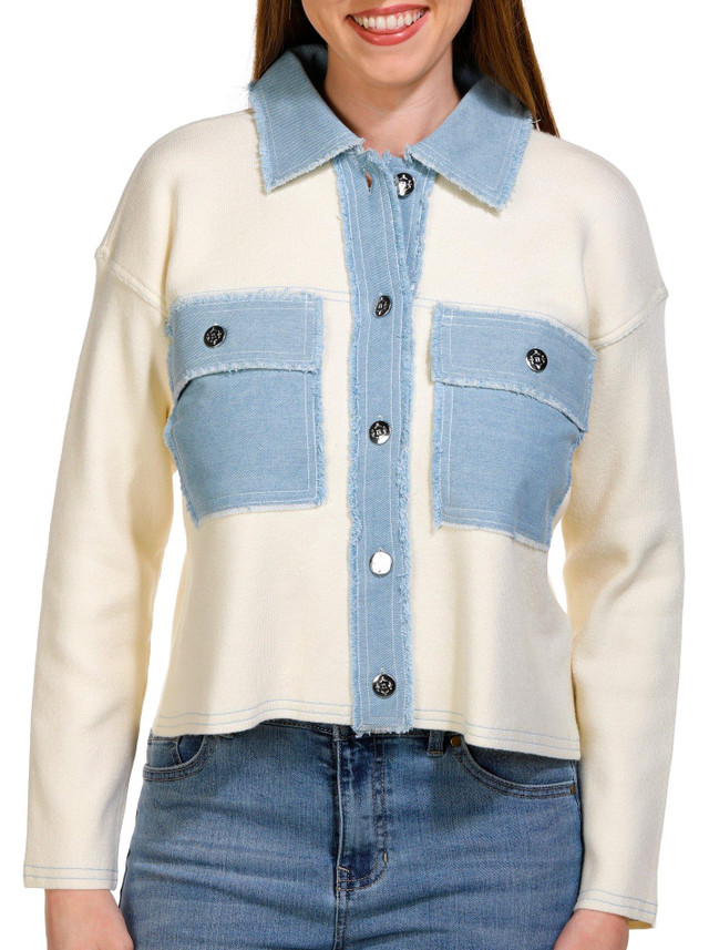 Introducing our Women's Denim Trim Jacket, a chic blend of cotton, nylon, rayon, and polyester. This stylish jacket features a solid exterior with light wash denim trim, adding a trendy touch to your outfit. The button-down front, chest pockets, long sleeves, and collared neckline combine functionality with fashion. Perfect for layering, this jacket is a versatile addition to any wardrobe, offering both comfort and style for any occasion.