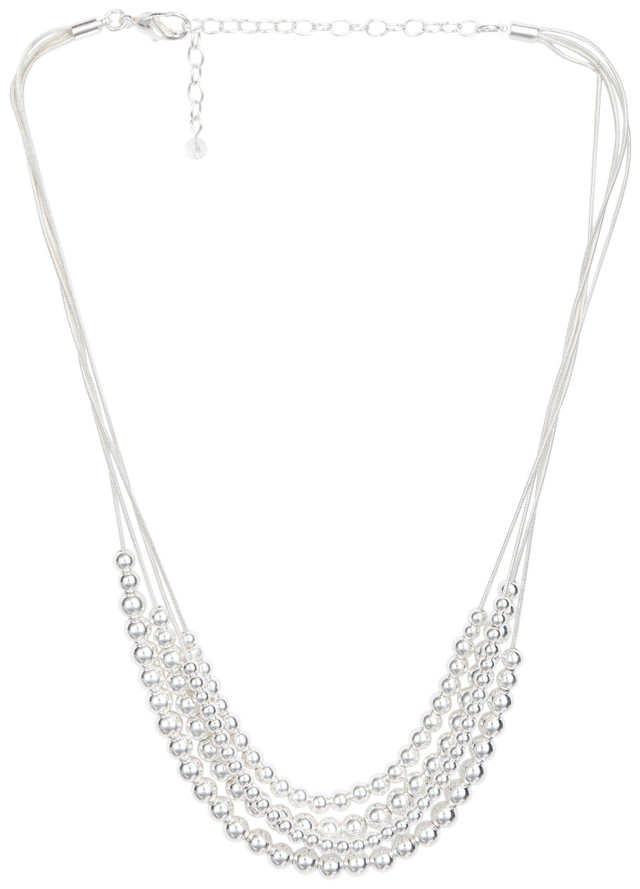 Add layered shine to your jewelry collection with the 16 in Caviar Silver Tone Multirow Necklace. Designed with multiple strands of polished silver tone beads in varying sizes, it offers texture and elegance in a single piece. Ideal for dressy occasions or elevating everyday outfits. Includes 3 in extender and lobster claw closure.