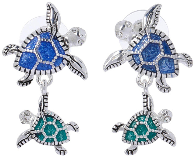 Make a splash with these playful double turtle earrings featuring silver-tone metal with sparkly blue and green accents. A vibrant blue sea turtle stud holds a smaller green turtle charm below, creating fun movement and ocean-inspired charm. Lightweight and perfect for any sea life lover.