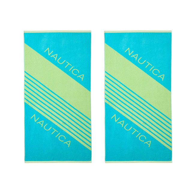 Elevate your pool or beachside style with the Nautica Tilted Logo 2-piece towel set. Showcasing the classic Nautica logo slanted in white against a soft lime and azure blue background with classic azure stripes, this eye-catching set is designed to turn heads. Made with non-toxic dyes and are oeko-tex standard 100 certified for quality and safety. Includes two matching beach towels, complete with a branded locker loop for added convenience. Each measure 68 in. x 36 in.