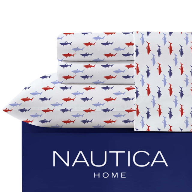 Add a splash of ocean fun to your bedroom with the Nautica Costazul Shark Sheet Set. Featuring a playful red and blue shark print, these 200 thread count cotton percale sheets are breathable, lightweight, and cool to the touch. The fully elasticized fitted sheet stays snug on your mattress, while the durable cotton construction ensures long-lasting comfort. Machine washable for easy care, this novelty set brings both style and function to your sleep space.