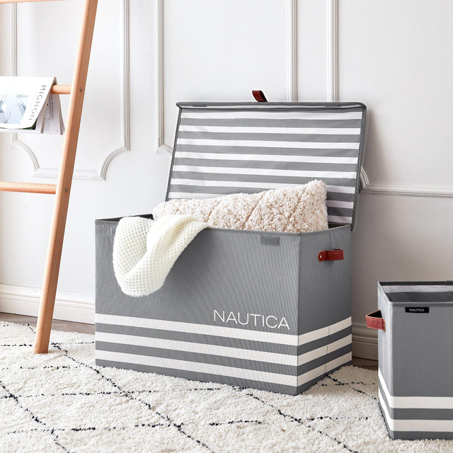 This Nautica Folding Large Storage Trunk with Lid offers a stylish and easily storable solution ideal for elevating any space in your home. This storage trunk features a lid to keep the contents concealed, durable reinforced handles and a convenient collapsible design for easy storage when not in use. The Nautica branding combined with the classic stripe design will blend in beautifully with nearly any décor. Easy to clean. Measures 24 in. x 14 in. 16 in.