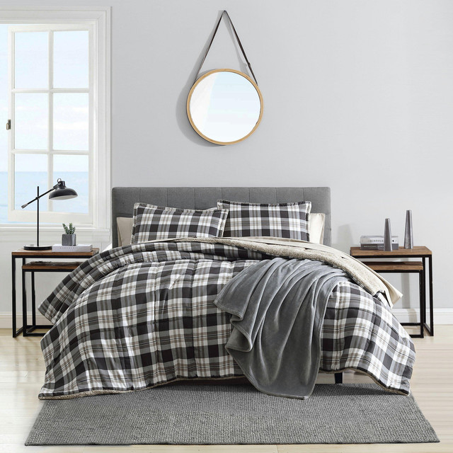 Turn your bedroom into a cozy environment with the Nautica Lewes Microsuede comforter and sham set. The grey and beige plaid micro-suede face reverses to a printed mingled beige sherpa. This super soft comforter is sure to keep you warm and cozy throughout those cooler winter nights. The comforter has a 100% polyester fill with 9 in. box stitching to keep in place. The included shams feature a European side closure. Machine washable for easy care.