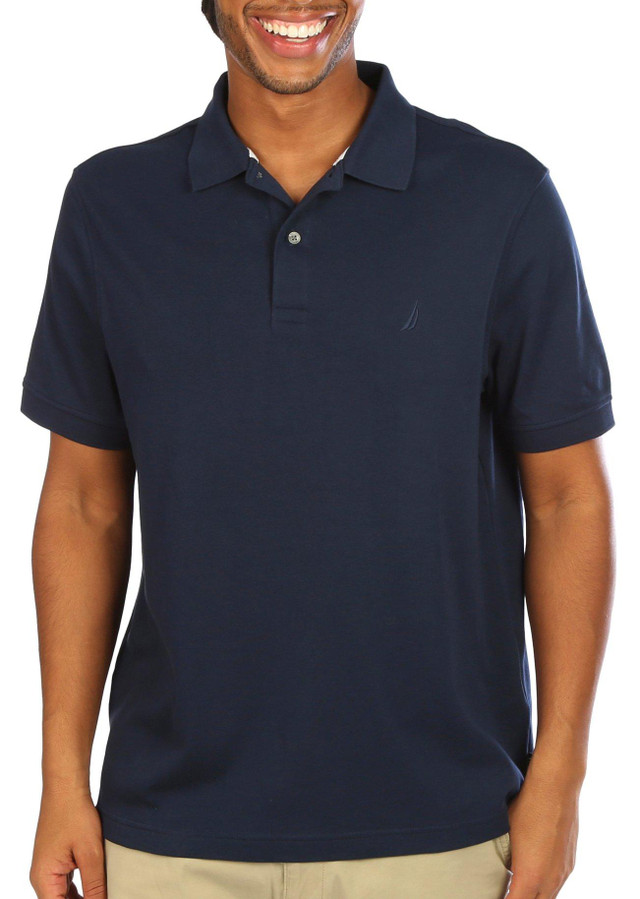 This polo shirt features a solid color design on lightweight fabric, 2-button placket, spread collar, short sleeves with elastic cuffs, embroidered Nautica logo on the chest, side slits at the hemline, and a classic fit.