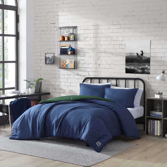 Head back to school in style with the Nautica 5-piece Comforter Bed Set. Featuring a reversible navy to pine green comforter and striped Harmead sheets, this bedding blends comfort and function. Made of soft brushed microfiber with a 6 oz polyester fill, its perfect for year-round use. Includes a sham, fitted sheet, pillowcase, and a reusable laundry bag. Machine washable for easy care.