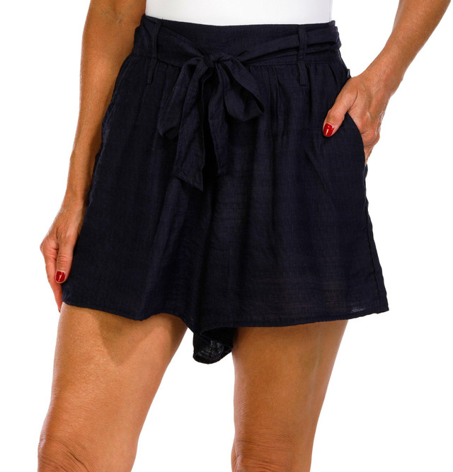 These women's belted shorts feature a solid color, a belted waistband, and side seam pockets. With a clean and tailored look, they offer both comfort and style for warm weather days. Fabrication 80% viscose, 20% nylon