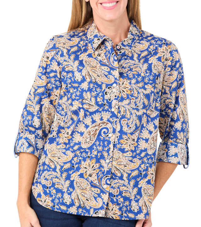 Softly patterned paisley elevates the classic silhouette of the Womens 3/4 Roll Sleeve Paisley Button Cotton Top. Crafted from crisp woven fabric, it features a button down collar, chest pocket with subtle embroidery, and 3/4 sleeves with contrasting roll tabs that can be extended and secured with button cuffs for long sleeve wear. Fabrication is 100% cotton. Length measures approximately 27 in.