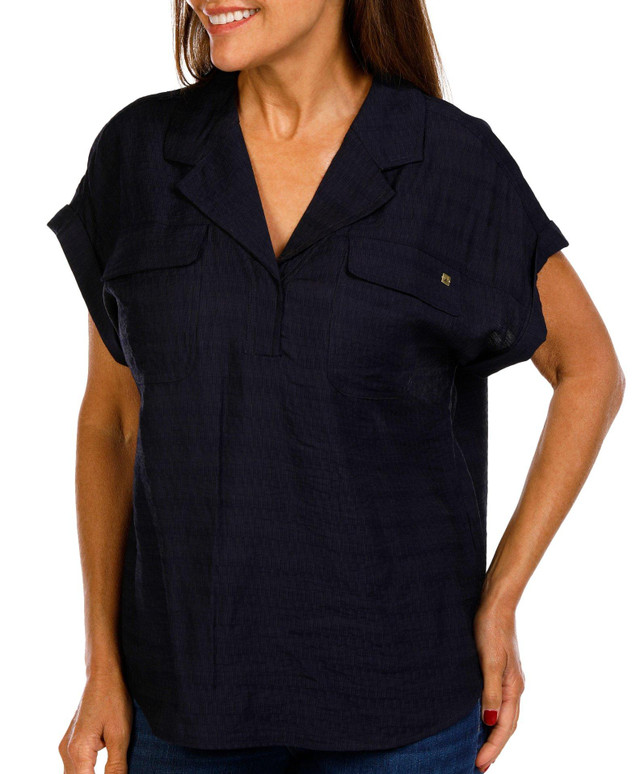 Add effortless polish to everyday style with a womens short roll sleeve camp top. Crafted from a soft, breathable blend of viscose and nylon, it delivers lightweight comfort in a relaxed silhouette. Finished with a classic collar, its ideal for warm-weather layering or casual workdays. Fabrication is 80% viscose, 20% nylon.