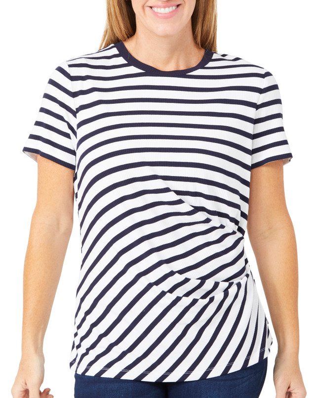 Elevate your everyday look with this short sleeve top featuring a stylish front twist detail. Made from a soft and stretchy blend of lightweight fabric, it offers a flattering fit and comfortable feel. Perfect for casual wear or dressing up, this top adds a modern touch to any outfit. Machine wash and lay flat to dry for easy care. Fabrication is 93% viscose, 7% elastane.