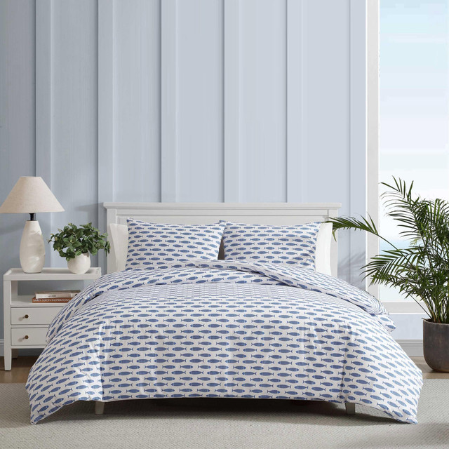 Update your bedroom space with the Nautica Woodblock Fish Duvet Cover Set. This classic print features fish motifs neatly stacked in shades of fresh blue on a white background. The duvet cover and shams are constructed of 100% cotton and made with a percale weave for a crisp feel, using single ply weave making it lightweight and durable. Oeko-Tex certified. Each duvet cover set is machine washable for easy care.