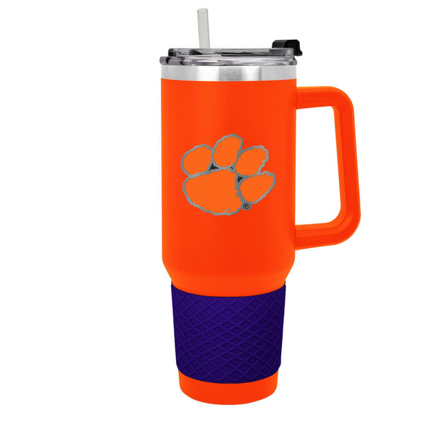 The NCAA Clemson Tigers 40oz. Team Color Colossus Travel Mug is forged from the finest vacuum-insulated stainless steel to keep drinks at the perfect temperature. Powder coated in vibrant team colors and a coordinating silicone grip, this mighty vessel is not just a drinkware, it is a declaration of loyalty! Features a meticulously handcrafted, officially licensed metal team logo and a dual-lid design. Straw included. Measures 4 in. x 5.5 in. x 12.75 in.