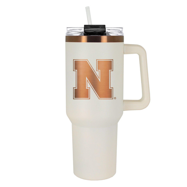 Meet the NCAA Nebraska Cornhuskers Colossus! This 40oz Copper & Crème travel mug is crafted from 18/8 stainless steel. With vacuum insulation, a dual-function lid, and a sleek powder-coated finish, it keeps drinks at the perfect temp all day. Laser-etched graphics add lasting style. Big on hydration, bold on design. Hand wash only. Measures 4 in. x 5.5 in. x 12.75 in.