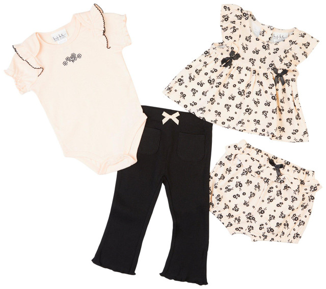 This charming set includes one top, one bodysuit, one pair of leggings, and one pair of shorts. Each piece features soft floral prints and a comfortable fit perfect for everyday wear. The top, bodysuit, leggings, and shorts are all made from a breathable blend of 60% cotton and 40% polyester, offering softness and durability. Easy to care for with machine wash and tumble dry instructions. Great for playtime, outings, or relaxing at home.