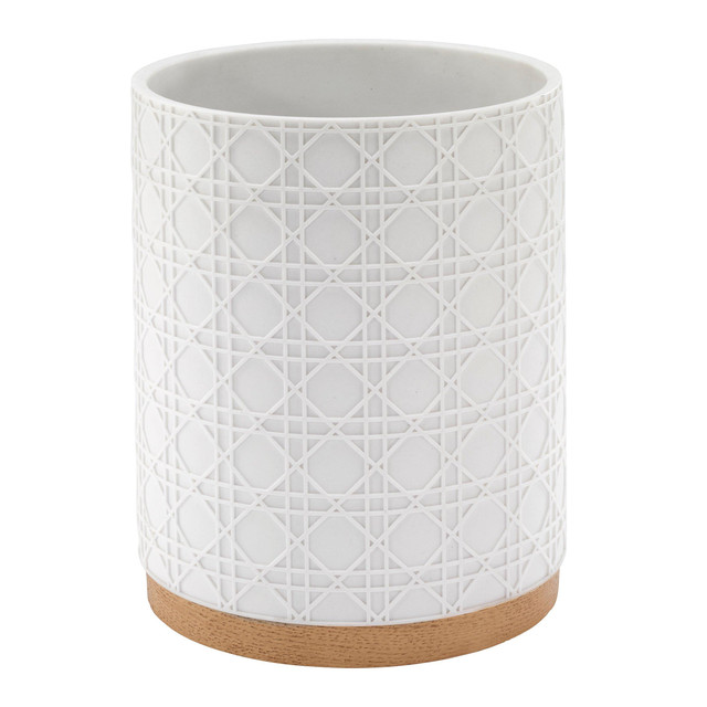 Elevate your bathroom decor with the Nicole Miller Lena Decorative Wastebasket. This chic piece features a raised white, large-scale caning design on a round body. Finished with a faux-wood base with life-like grain, it adda a touch of modern elegance to any room. Made of durable sand resin for easy care and a long life. Measures 7.60 in. x 7.60 in. x 10.00 in.
