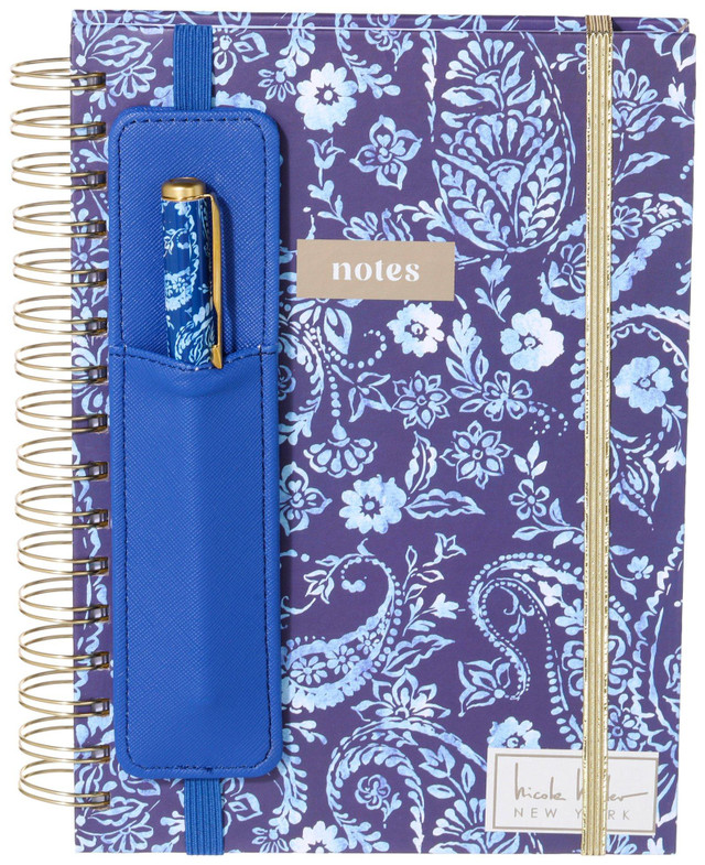 This spiral journal features an elegant paisley design with a matching pen and built-in pen holder. An elastic band closure keeps everything neatly secured for journaling on the go. Measures approximately 8.5 in x 6.5 in.