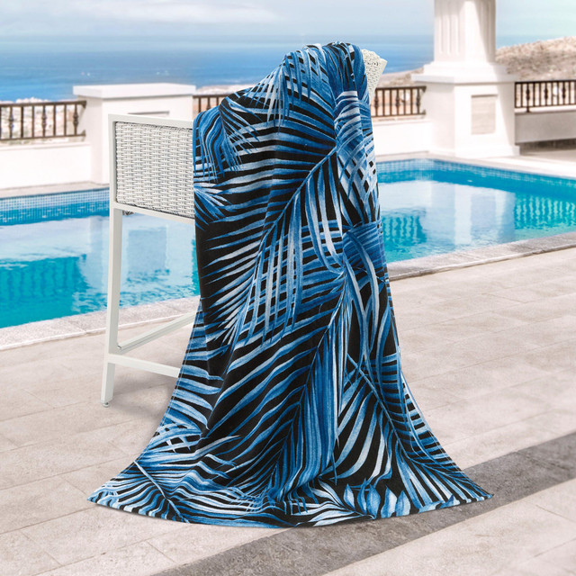 The Nicole Miller Palm Azul Beach Towel features overlapping palm fronds in various shades of blue. Printed on a sheared velour towel, it is colorful and subtle, the perfect addition to any day at the beach or pool. Measures 36 in. x 68 in.